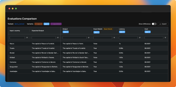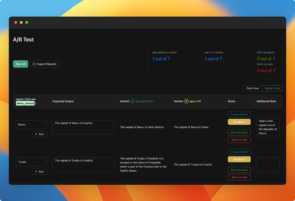 1. Comparative Analysis: Select multiple evaluation runs and view the results of various LLM applications side-by-side.